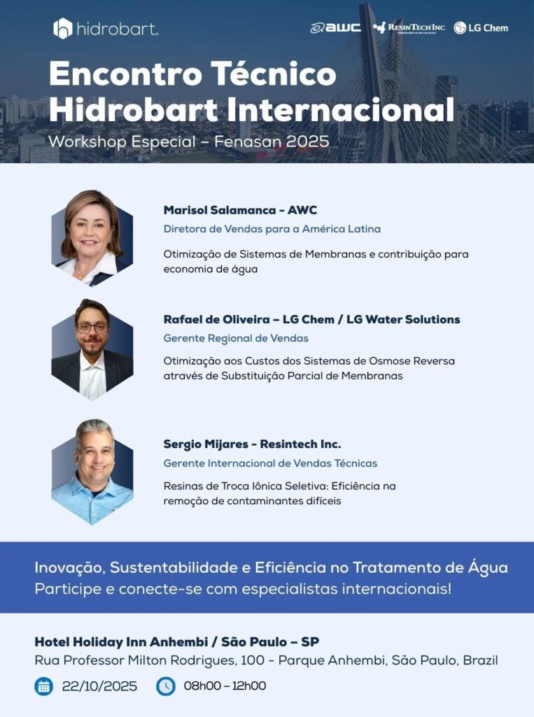 Pensando nisso, a HIDROBART S.A. de C.V., em parceria com AWC (American Water Chemicals), ResinTech Inc. e LG Chem (LG Water Solutions), tem o prazer de convidá-los para o nosso 1º Seminário Técnico, com foco em desempenho operacional para Osmose Reversa e Troca Iônica.